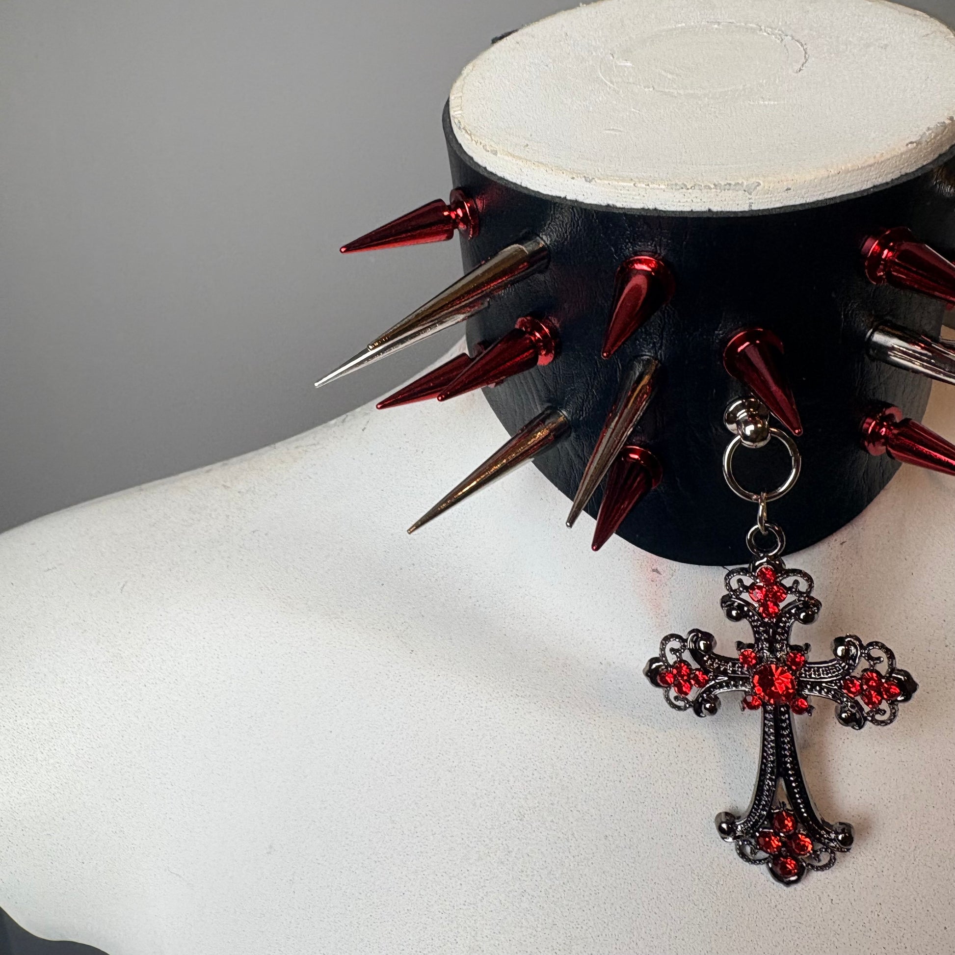 Chocker ampio con base nera e borchie oleografiche rosse. Croce pendente brillante. Chiusura regolabile di circa 42 cm