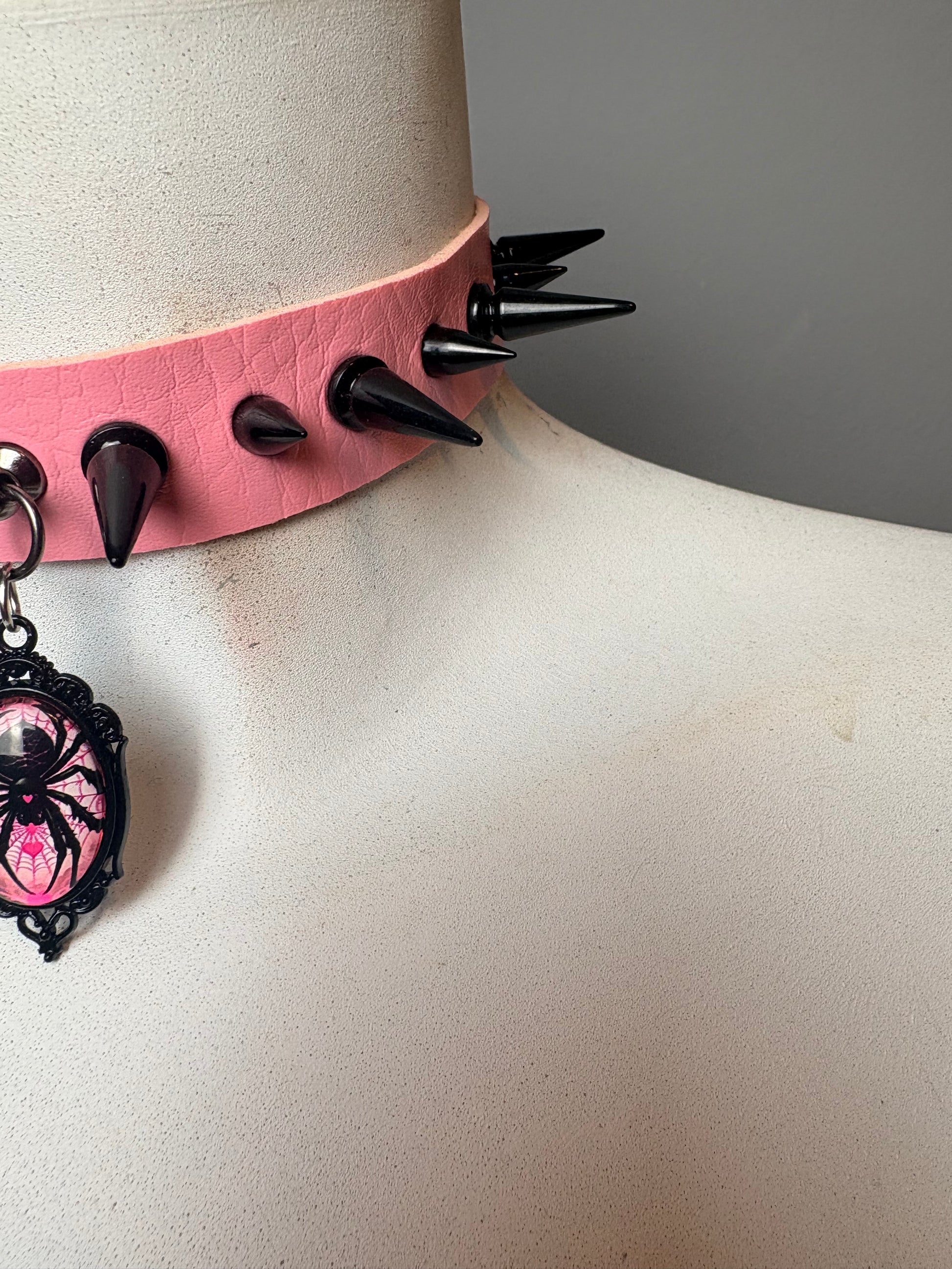 Chocker girocollo con borchie di due dimensioni più grande e più corta con ciondolo pendente con immagine di ragno.