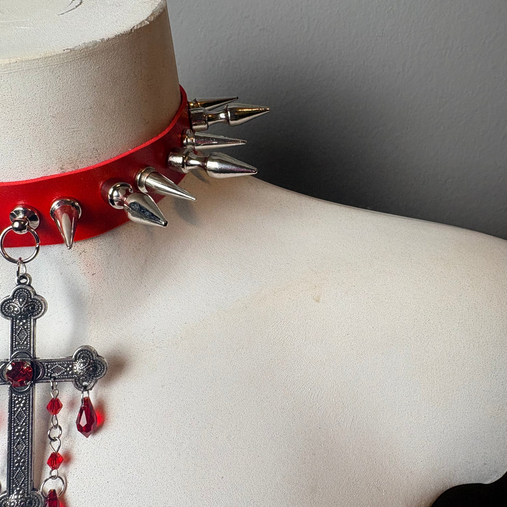 Vendo chocker elegante rosso con croce e borchie. Chiusura regolabile di circa 42 cm