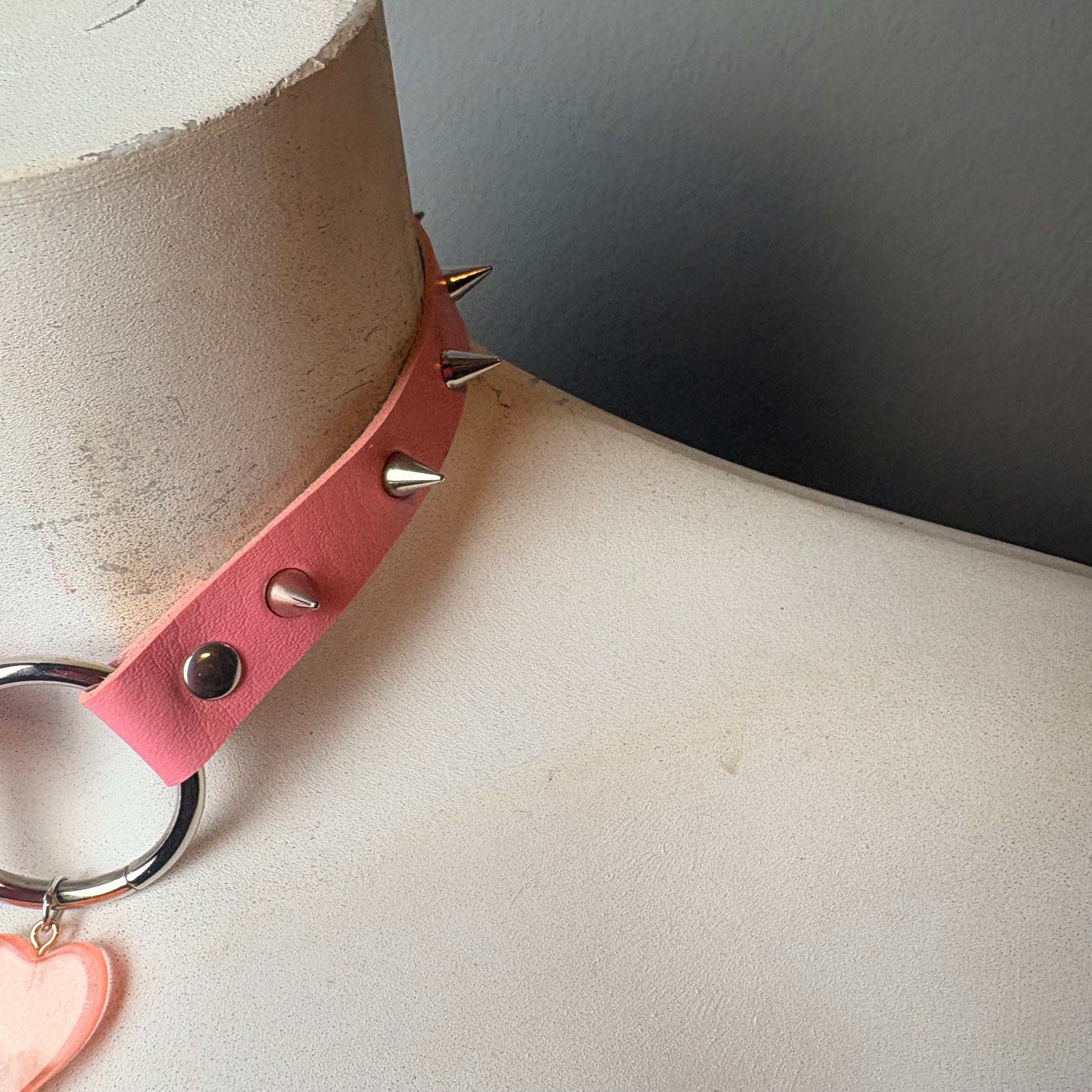 Chocker rosa largo con borchie piccole e cerchio centrale.
