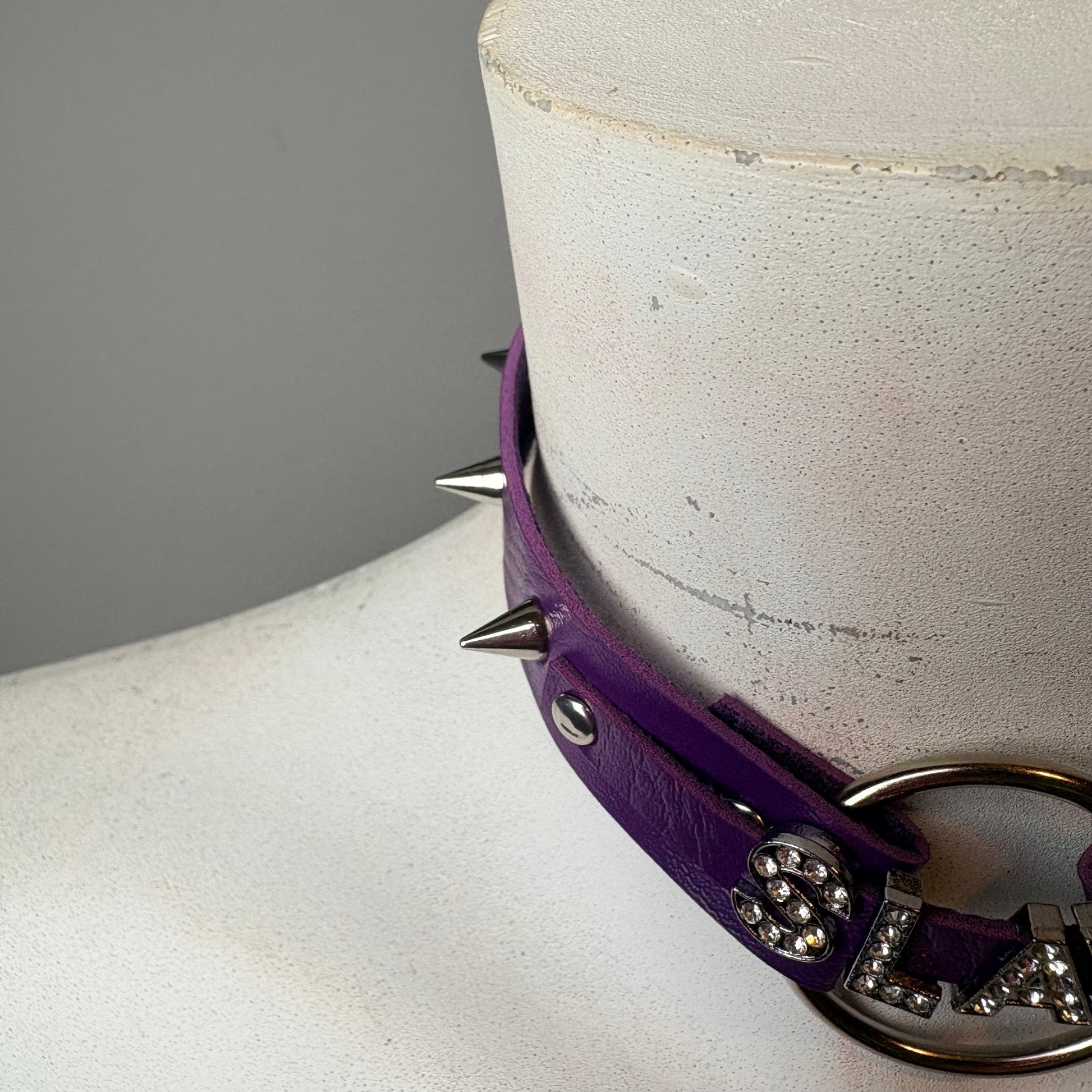 Chocker viola con scritta “slave” con cerchio centrale e borchie. Chiusura regolabile di circa 40 cm