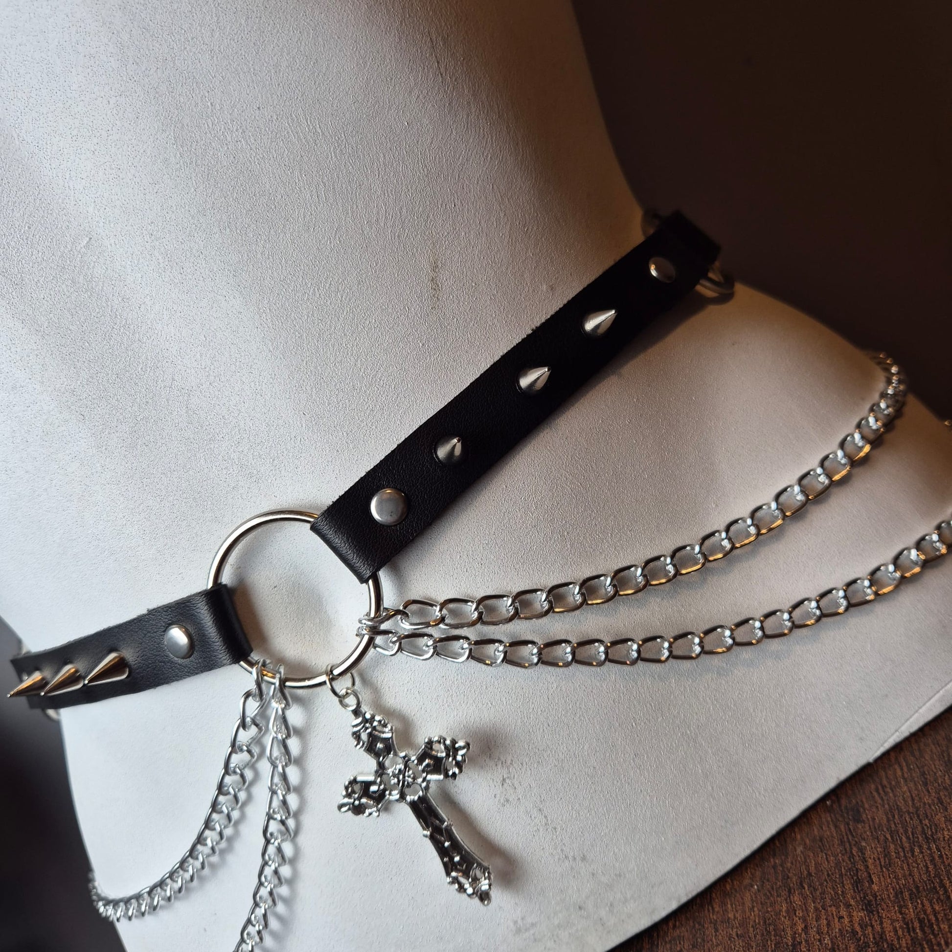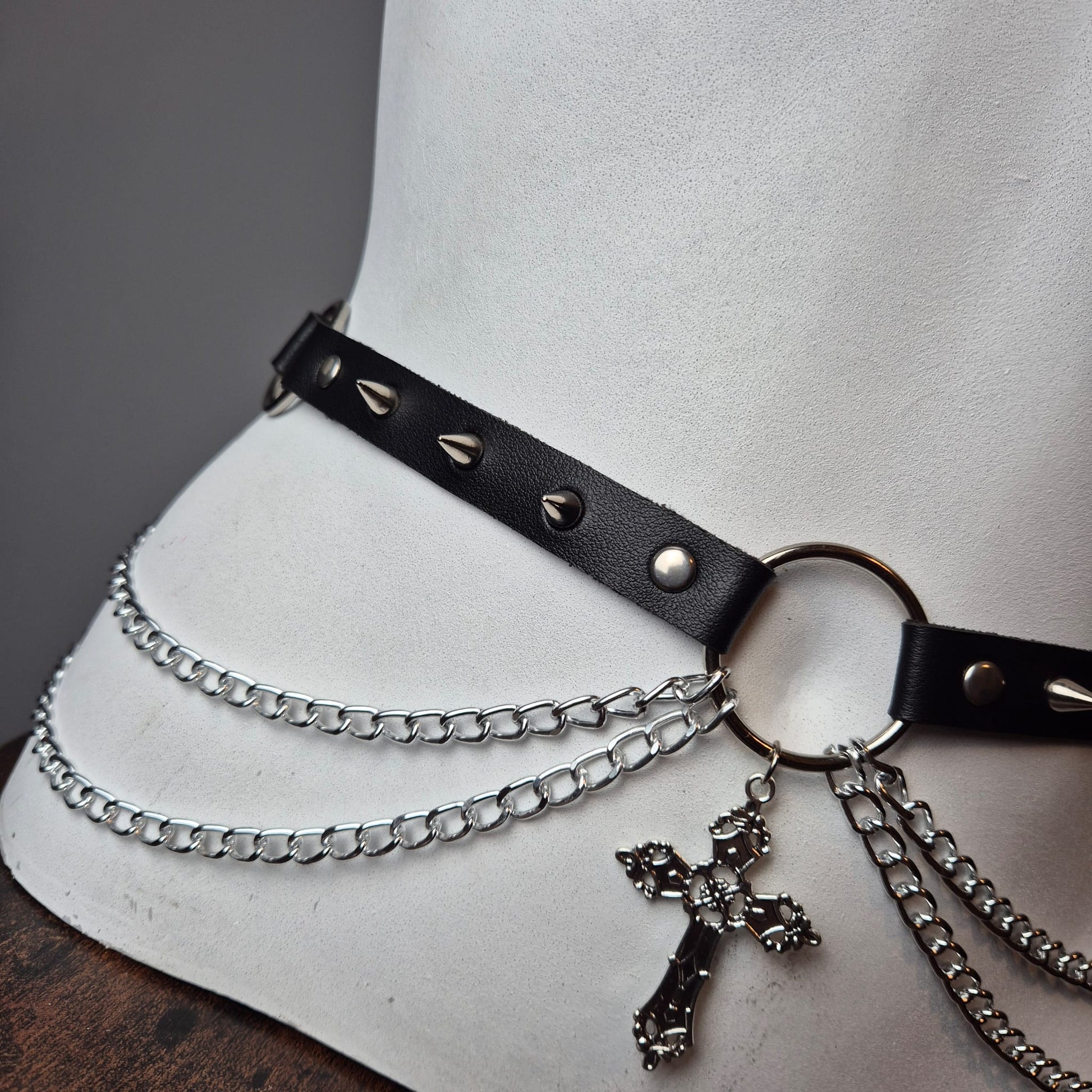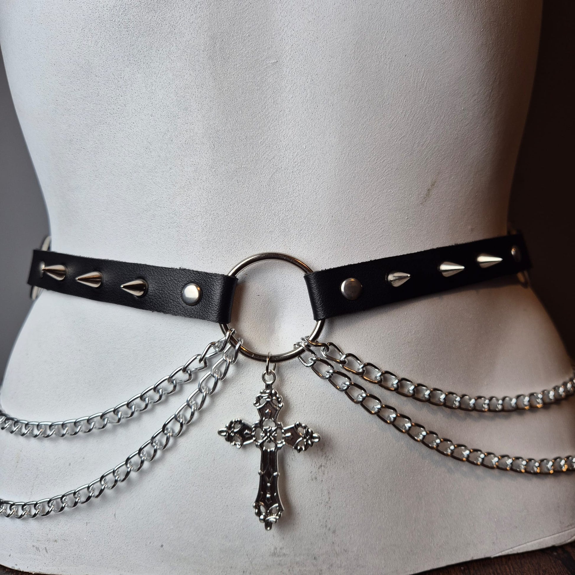 Cintura nera in vita con ciondolo pendente di croce e piccole borchiette argento.