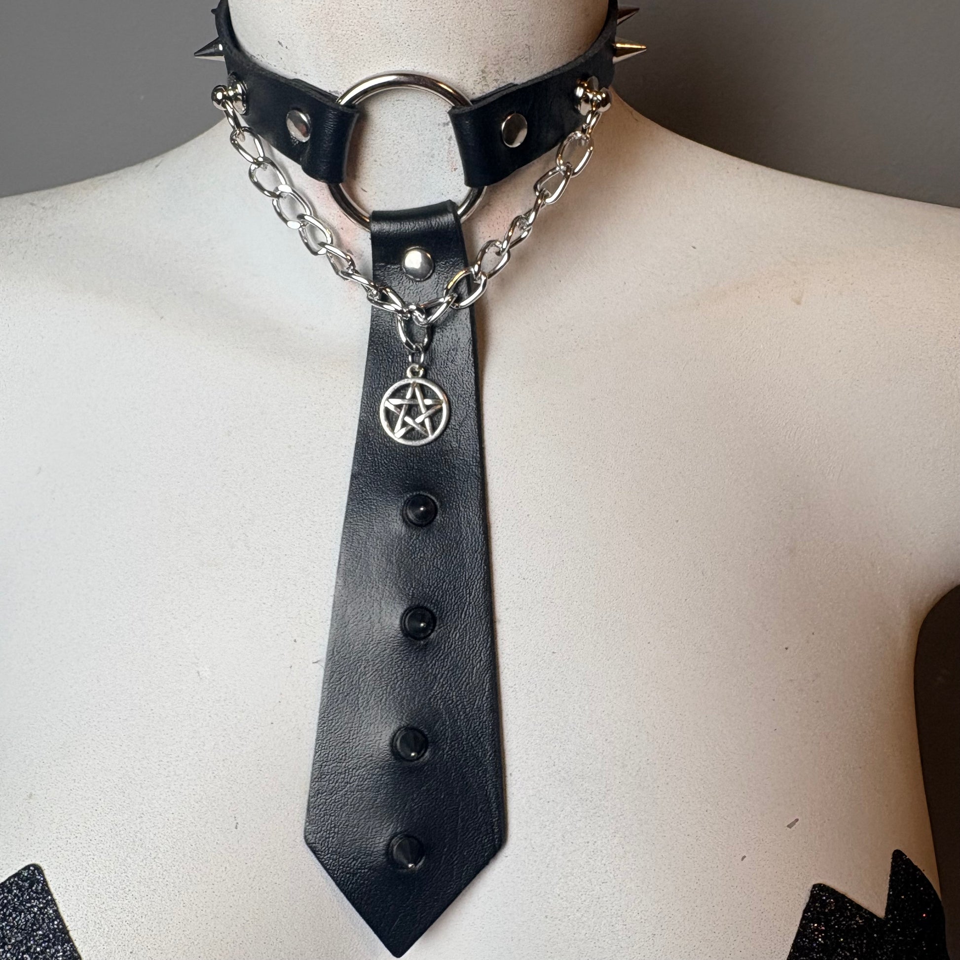 Cravatta nera con borchie argento, catene argento e ciondolo a forma di pentacolo. Chiusura regolabile di circa 42 cm