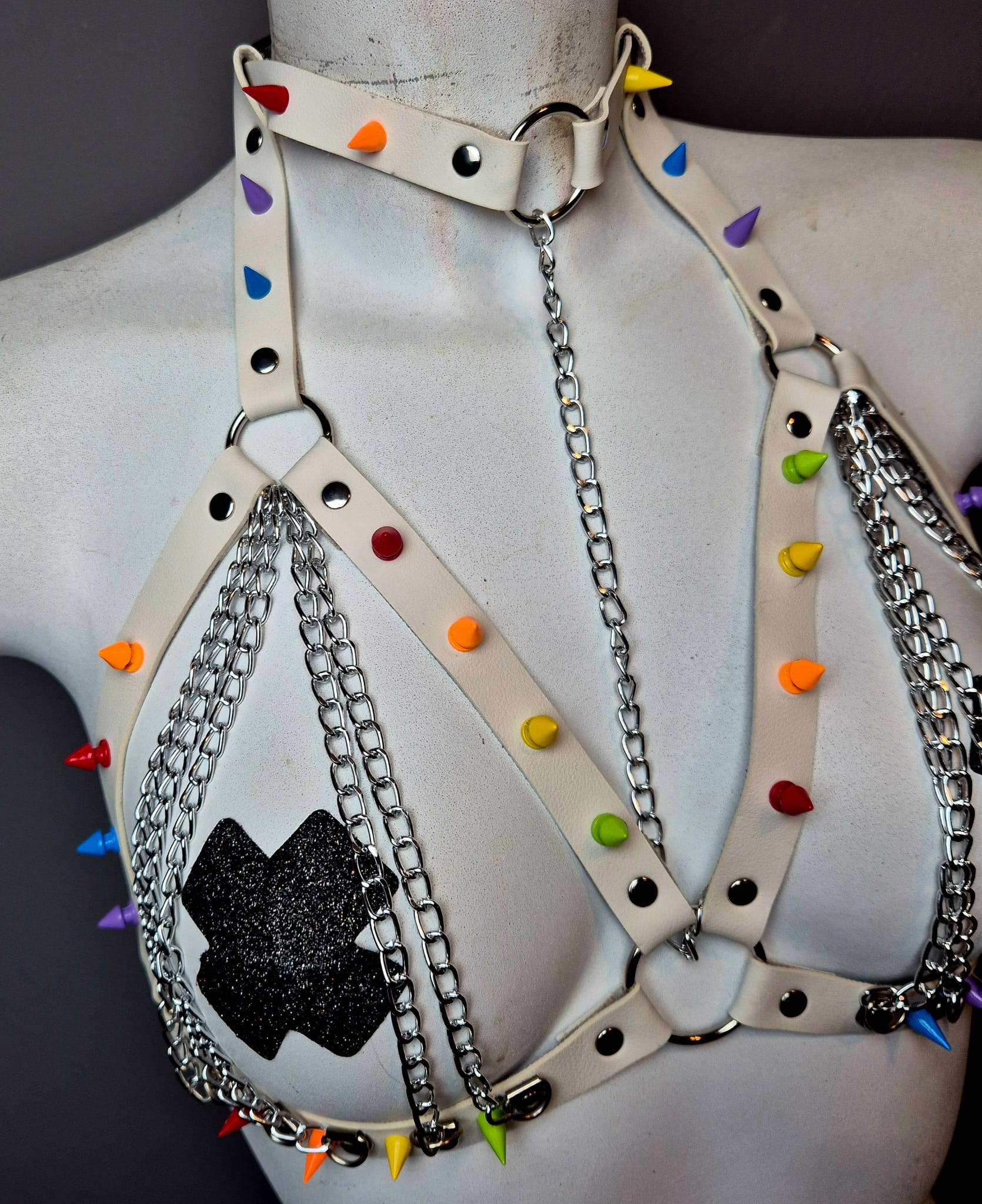 Harness bianco con borchie colorate arcobaleno.