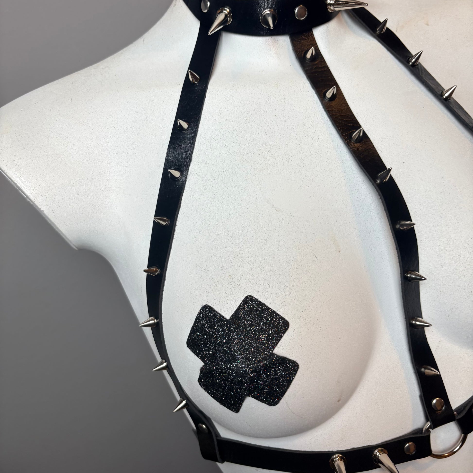 Harness nero unisex con borchiette argento e chiusura regolabile sul collo e schiena.
