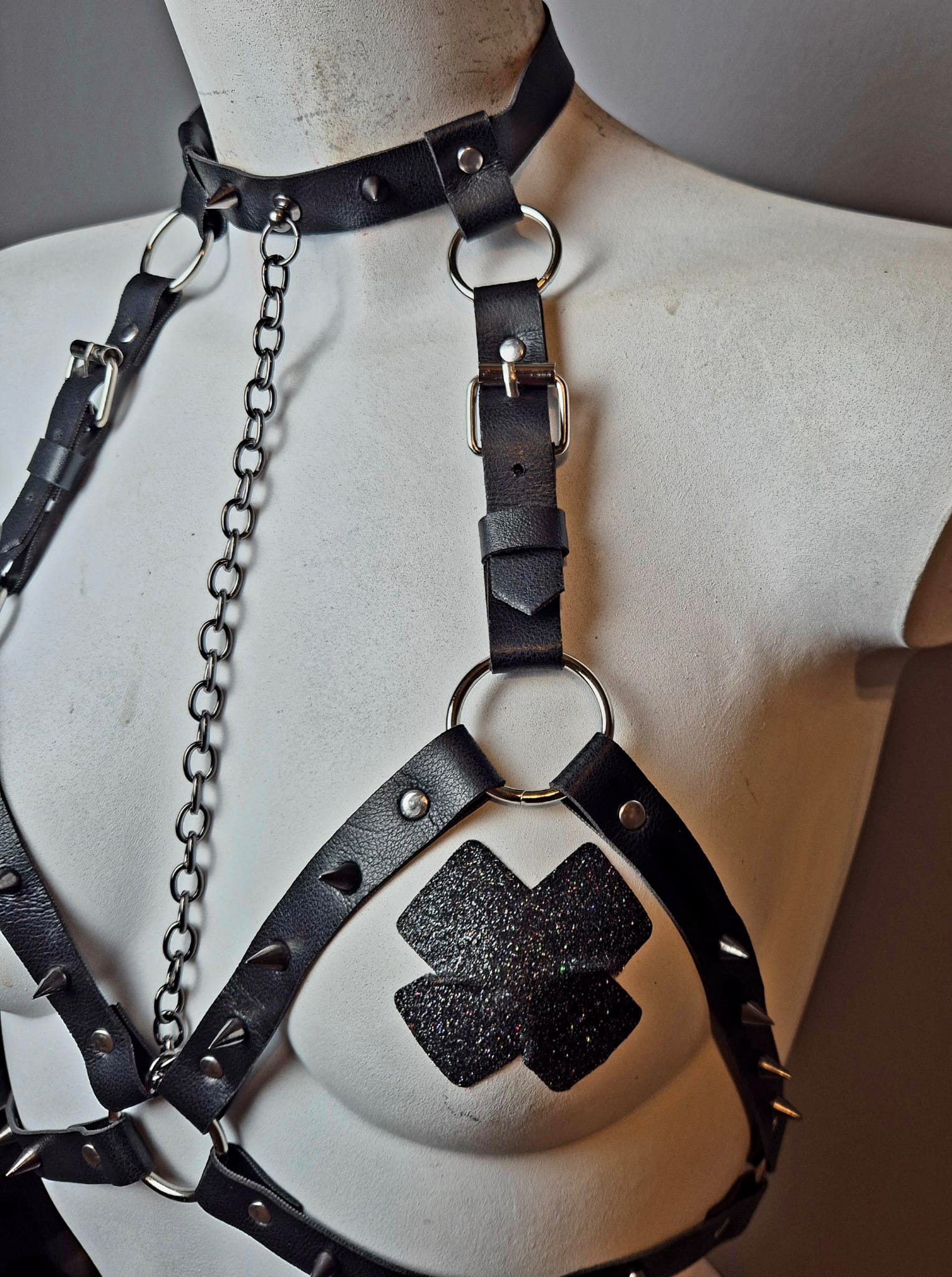 Harness nero con catena lunga sotto il collo.
